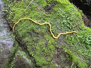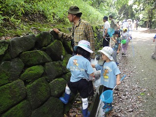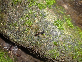 【左】トンボ採り 【中】雨後の岩壁には生きものがいっぱい 【右】オオケマイマイ見つけた