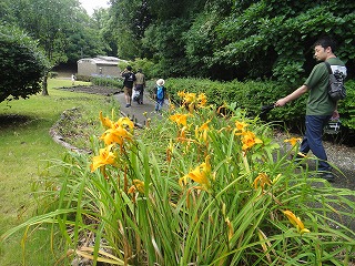 【左】大きなイセノナミマイマイ 【中】ノカンゾウ開花中 【右】分かち合いとまとめ