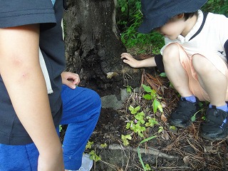 【左】木の幹にいつぱいキセルガイ 【右】セミ(幼虫)発見