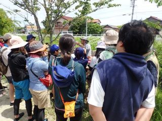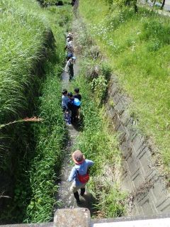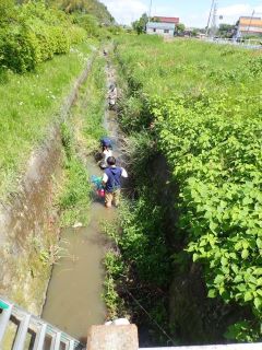 川では指導員の浅井一から生き物の捉え方等のポイントと川の中での安全な行動と注意事項を説明し、川への下降は観察会員のサポートで、脚立梯子を伝って下り、草の茂みなどにタモをセットしてジャバジャバと足で追い込み獲物を捉えるのに夢中に、また、タモの中に何が入っているか一生懸命探していました。
