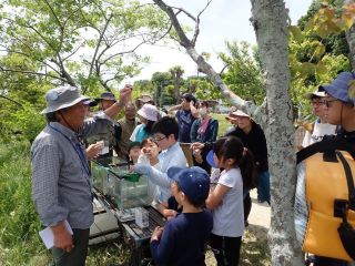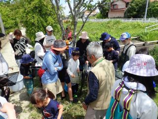 その後、参加者が捉えた魚等の生き物をミニ水槽に入れて観察し、指導員の田中央による代表的な魚類等の捉えた生き物のおもしろい話で、観察会は賑わって大成功、参加者の皆さんも大いに楽しいでいただけました。(記:吉川勉)