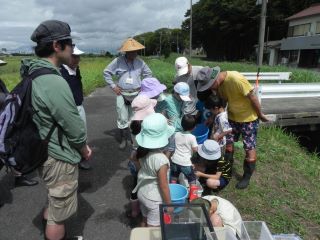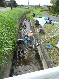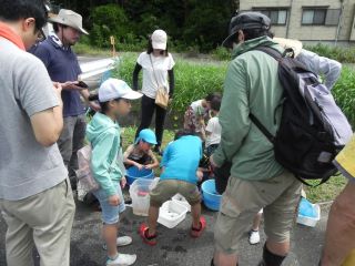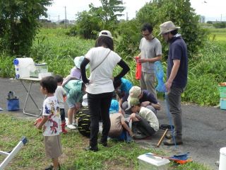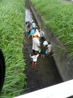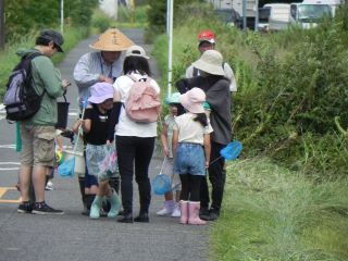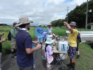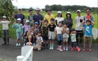 昨夜からの降雨が朝方まで続き心配しましたが、その後晴れ間が出て薄曇りで観察会が実施できました。 未来館からの挨拶、及び指導員から出発前にトイレを済ませることや、特に水路でのタモの扱い方や魚類の捕獲の仕方などについて説明後、いざ出発!  出発直後には、最初からスクミリンゴガイの観察、道中の水田沿いの畦道ではシオカラトンボやキチョウの捕獲が始まり子供らは夢中でした。   神田川の観察場所に着くと、早速子供たちは水路に入りたがり、水路に入ると水深が15cmほどであったことからこども用長靴に水が入ってしまいましたが、すぐにタモで魚などの捕獲に夢中でした。  モクズガニ、ゴクラクハゼ、ヨシノボリのほか10pくらいのウナギが2匹、大きなミシシッピーアカミミガメが捕獲され、歓声が上がっていました。後の説明会ではみんな熱心に眺めたり、触ったり、写真を撮ったりと、良い観察会になりました。  そして、水路沿いで未来館に戻る前にみんなで記念写真         (記:吉川)
