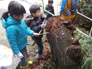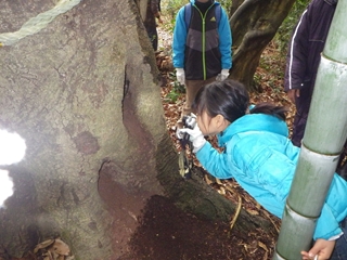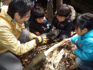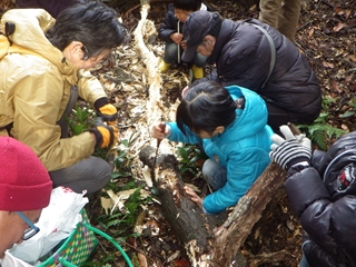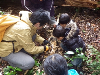 社叢内では定番の“トタテグモの巣”を見てから朽ち木を探す。間もなくいいものに出会いました。コクワガタの幼虫もたくさんいて、こどもたちも喜んで持ち帰りました。というのは竹内秀先生が空の容器をたくさん用意してきていて、それで飼育セットをこどもの人数分を作って下さったのでそれがお土産となりました。