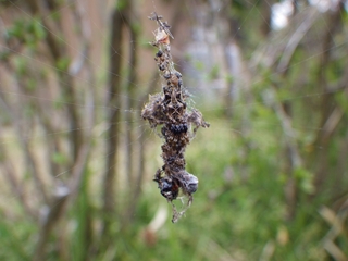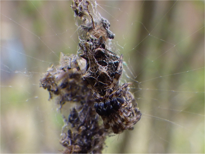 【左】ゴミグモ…正直言って家主はいないと思った 【中】同左。少し家主が動いた。クリック→拡大 【右】ゴミグモを観察