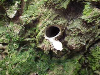 箭比神社の鳥居の前のサクラは、若葉が芽吹き、満開とは異なるピンクとグリーンのコントラストの美しさが感じられました。神社の森では、毎年恒例の2種類のクモの巣を観察しました。まず、ご神木でキノボリトタテグモの巣を観察しました。今年は、巣の数が少なかったように感じます。家主も不在でした。(※調べたところ成体のメスは通年いるようですが、未だ出会えたことはありません。)