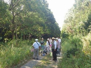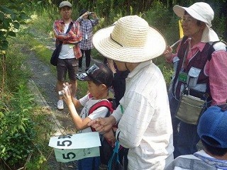 好天に恵まれ、下見より遙かに多くの生き物を観察した。大人の方も子供も大変熱心で、モンキチョウ、バッタ、ウスバキトンボ、テントウムシ等を捕らえて、大喜びである。 途中、オッタチカタバミで10円玉をみがいたり、笹舟、笹の飴、ツバキの草履等を作ったりした。草履については、現代の子は分からないので、お母さんが「草履はサンダル」と説明して下さって助かった。グリーンベルト帯が竹やクスノキ等の大木に囲まれ、日陰になっているので、涼しくて気持ちよく観察することができた。(記:吉房)