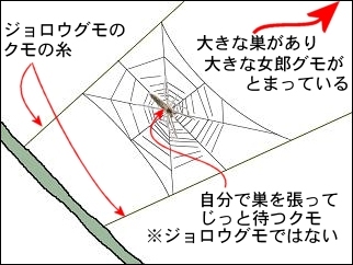 【右】クモは細長形(1cmぐらい)。図はあくまでイメージであり網の張り方は全くあやふやであります