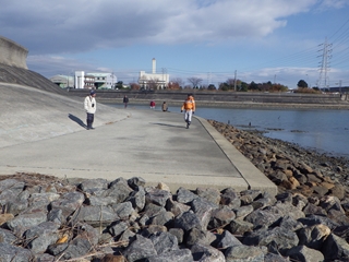 @ 池の護岸を登って、車道を横切り、隣の工場の砂地のグランドに産卵する。(もちろん、ほかにも産卵適地はある)