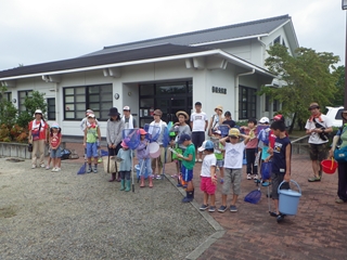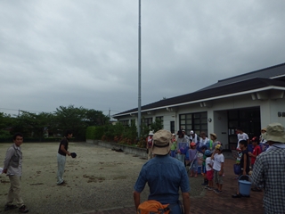 すなわち、集合場所である修農公民館のグランドで開会行事を行い、そこから歩いて橋の近くの観察地点に向かって出発した。