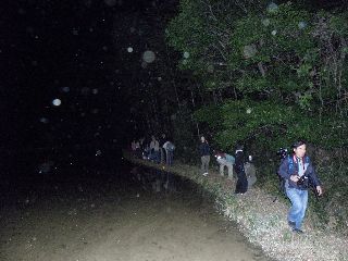 東浦町環境課募集による観察会。はじめて、集合場所をうのはな館駐車場とした。参加者は40人ほど、気温は低めだったけど蛍20匹ぐらい人間2人に一匹あたりはいたかな・・・?といった感じです。見られるポイントにつくまでに例年一,二匹は見られるのに一匹も見られなかったので、見られるかと心配しましたが、時間が遅くなるに従って、いつものポイントで1匹、また1匹と、ふわりふわりと飛び始めました。(思わず歓声!があがりました)ホタルのポイントの変化には、街灯の明かりや除草剤が関係しているような気がします。ホタルたちの年に一回のデートのじゃまにならないように懐中電灯は消して光を見つめます。おしりが光っているの?大きさは?といった疑問が聞かれたので、ちょっと失礼してホタル君にケースに入っていただきました。10時半頃になると、月が東の空から出始め、北斗七星に見送られ、蛙たちの鳴き声を聞き分けながら、11時近くに解散となりました。 1週間後の方がよく見られるかもしれない。ということでした。(記・竹内秀 )