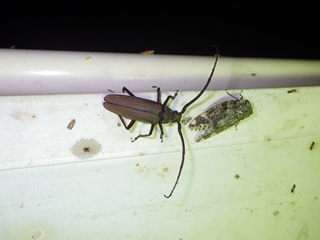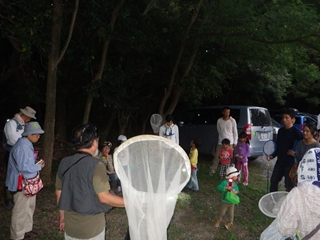 会を始めた時間はまだ明るく、ニイニイゼミの声に混じってアブラゼミの声が少し 聞こえる程度だった。今年は羽化が遅れているのだろうか。灯火採集は駐車場からす こし林に入ったところに準備をしていただいた。ニイニイゼミ、コフキコガネ、ドウ ガネブイブイ、アオドウガネ、カミキリムシ、コガネムシやガ仲間を観察することが できた。 (記:竹内秀)