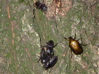 乾燥の割に樹液の出ている木もあり、コナラでコクワガタの雄、雌を見つけて、みん なが元気になった。そのうちにカブトムシのなっている木もあり、久しぶりにたくさ んのカブト、クワガタを見つけることができた。コクワだけでなくノコギリクワガタ も数頭ゲットできた。カナブンが多数いるコナラのレストラン、羽化直後のニイニイ ゼミ、羽化直後のニイニイゼミを食べているムカデなどいろいろ見ることができた。
