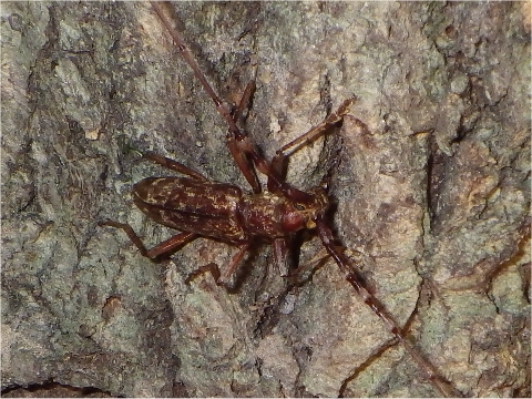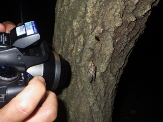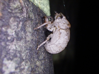 最近雨が降っていないので、林は乾燥気味だった。期待薄かと思いつつ、虫を探し て林の中へ。初めのうちは、かさっと動くものキマワリにも歓声が上がっていたが、 だんだん見られるもののレベルが上がってきてキマワリには目もくれなくなった。、 ニイニイゼミのを見つけながら進んだ。「ニイニイゼミのなる木」のようにニイニイ ゼミの抜け殻や羽化しようとしている幼虫がたくさん登っている木もあった。カラ スヨトウガが冬眠ならぬ夏眠をするという話を聞き、上を見上げると真新しい巣箱に 示し合わせたように何匹もついていた。