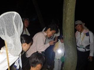 【左】こんな場面にも出会った   【右】園内の散策路のハイキングを終えて→灯火採集の前で虫さんの説明