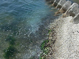 【左】クサフグが集まっています 【右】海水が精子で白く濁っています