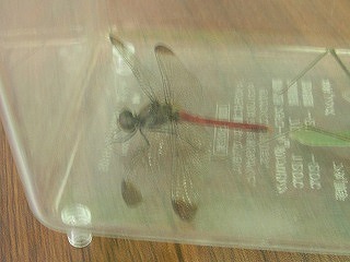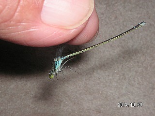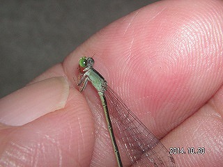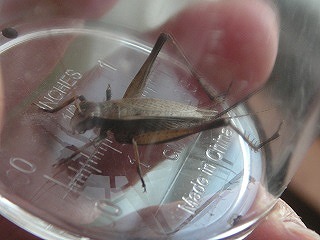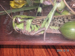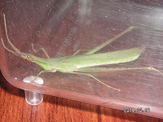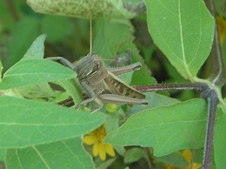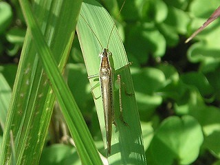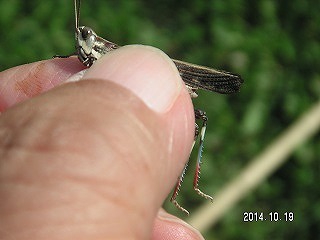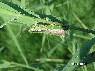 【左】ホシササキリ 【中】マダラバッタ(後足脛部が赤青黒白のまだら) 【右】クロイトトンボ?(アオモンかクロ。胸の模様でクロ)