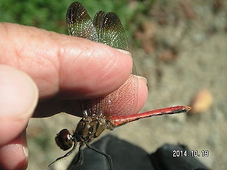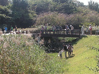 雲一つない絶好の天気になりました。9:30に管理棟会議室に集まり、職員のあいさつ、指導員紹介の後、村瀬さんがコース、注意事項を説明しました。準備して管理棟前の広場に集まり観察に出発しました。6月と同じ「生き物達の谷」を左回りに一周するコースを観察しました。所々で吉川さん、村瀬さんがいろいろな植物の、においをかいだり、試食をしたり話をしてくれみんな熱心に聞いていました。秋はバッタとアカトンボの季節です。バッタはコースの土手のいたるところにいろいろな種類が飛び跳ね子供たちはもちろん親御さんも楽しく追いかけていました。大型のトノサマバッタは人気がありましたが遠く速く飛ぶのでみんな捕まえるのに手こずっていました。探してもなかなか見つからないマツムシ♀が偶然見つかり指導員たちが驚きました。一方トンボのほうはさっぱりで半周位した沼の縁で浅井さんがやっとイトトンボを見つけました。そして4分の3周位した沼の縁でまたも浅井さんが枯れ枝の先に止まる念願のアカトンボを見つけました。慎重に網に入れて調べたところ翅の先が黒いリスアカネでした。周辺を探したら何匹も見つかりましたがすべてリスアカネでした。一周近いところの橋の上から皆でザリガニを眺めていたら11時を過ぎてしまい急いで会議室に戻りました。村瀬さんが、見つけた生き物のまとめをし、吉川さんが植物のお話をして閉会となりました。(記・平松俊)