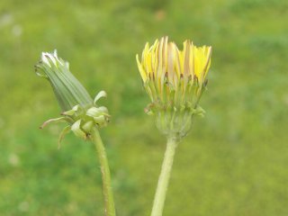 【中】外来のセイヨウタンポポ(左)トウカイタンポポ(右)