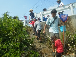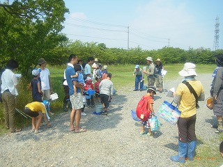 猛暑の中、ガサガサ好きの家族が準備万端、集まってきました。簡単な注意の後、集合場所の青海公民館から目的地に移動しました。