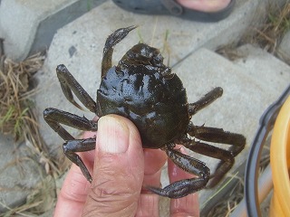 【左】カダヤシ(外来) 【中】クロベンケイガニの住みか 【右】子供はカニさん大好き(クロベンケイガニ)