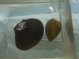 シジミ、イシマキガイ、アレチハナガサ(外来)