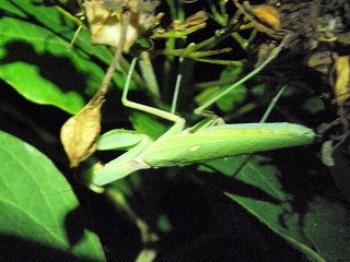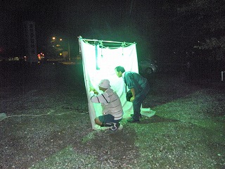しばらく水銀灯に来る昆虫を観察後、ナイトハイクに出かけました。アオマツムシが大きな鳴き声をしてほかの虫の音をかき消す位でした。少人数のためまとまりがよく神社を一周しました。ヨモギとクズが茂った土手が綺麗に刈り取られれていたためか、毎年聞くことが出来るカンタンの鳴き声が聞けませんでした。今年はガの仲間が少なく、ミズスマシやゴミムシの仲間がたくさんおとずれていました。(記・降幡 )