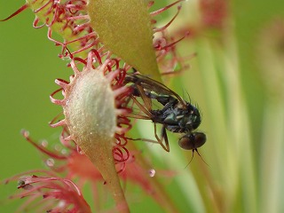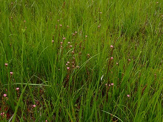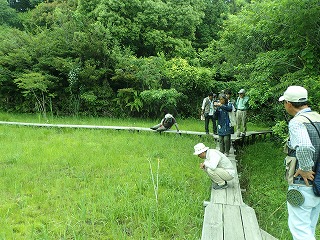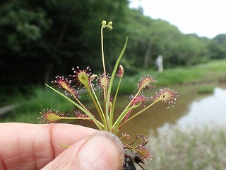 天候もどんよりとした週前半の暑さはなく観察には適している。出発前の挨拶とコースの説明をして予定時間の5分後に8名で出発する。少し遅れて2名が合流、樹木の花を見るには少し遅くネジキ、ハゼノキ、ネズミモチ、ノイバラ、ウメモドキの花を見る。すでに小さな実を付けているものが多くヤマクワについては色も付き食べごろ、皆で賞味するが感想の言葉は「まずい・・」誰一人、美味しいとの言葉は聞けませんでした。湿地では、日差しを浴びていればピンクのトウカイコモウセンゴケの花が見られるが天候のせいで残念ながらチラホラ。しかし食虫植物だけに腺毛で小さな虫をゲットしている状態を見る事が出来ました。今年はハッチョウトンボの数も多く通路から手の届く位置で見る事が出来、♂・♀撮影には最高でした。おそらく皆さん良い写真が撮れたと思います。また最近は外来種について耳にするが湿地内でもモウセンゴケの仲間であるナガエノモウセンゴケが猛烈に繁殖している現実を目にする。帰り道で竹藪の側に置かれている箱のミツバチの話題ではこの場所で何の花の蜜を求めて飛んでいるのだろうかと話しながら予定の時間に帰着しました。(記・宮内)