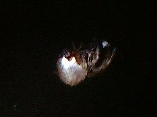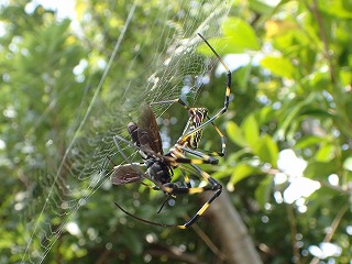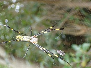 【左】 ハエの仲間をとらえたジョロウグモ 【右】 ジョロウグモの巣の中聞いたシロカネイソウログモ