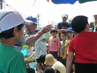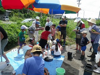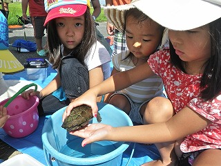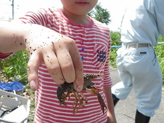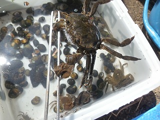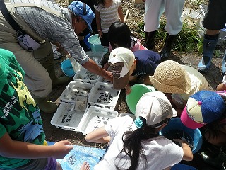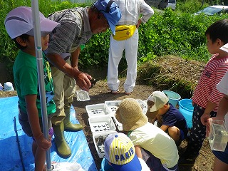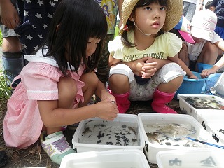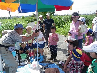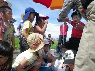 お陰でこどもたちが捕獲した生き物がたくさんの種類と量となり、分かち合いによる生き物の説明では、こどもたちは順番に触ったりつかんだりして楽しそうでしたよ。