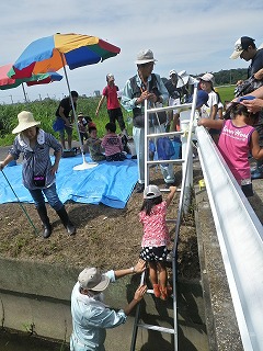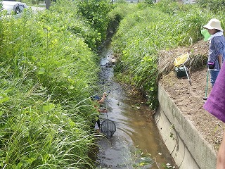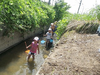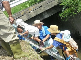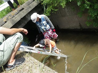 その後は、神田川(じんでんがわ)で水路(川)に生きる生き物の捕獲を開始しました。参加のこどもたちは水遊ぶを兼ねて次々にやや水位がある水路へ入って行きましたよ。