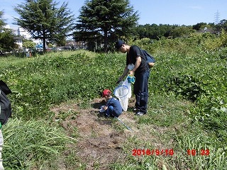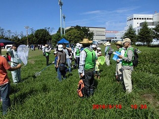 会議室で会社の様子やグリーンベルトの歴史と現在観察した生き物に付いての説明があり、4つのグループに分かれてグランドに出た。昆虫が楽しく活動できる好天気に恵まれ、上空にウスバキトンボやシオカラトンボ、足元の草むらにコオロギやバッタが沢山いて子供達の歓声が上がった。全員がなにがしかを捕らえ虫かごに入れることができ大喜びである。グランドでは4面使って、会社対抗のソフトボール大会が行われていたにもかかわらず、自然調査隊が緑地帯へ入るため、一時試合を中断し、皆さんにこやかに手を振って送り出して下さった。グリーンベルトの木々は年々立派に成長していて驚くばかりである。ただ台風で大きな木が数本倒れかかっている様子から、埋め立てのため地下に十分根を張ることができないのだと痛感した。子供達は木々には目もくれず、クワガタ、カブトムシ、セミ等を探すのに夢中である。鳥に食べられてばらばらになっているカブトムシの残骸がいくつもあり「何が食べたのだろうか?」とがっかりしていた。池の前でクワガタムシが沢山集まるというシラカシの穴を交代で探していたが、全員分は見つからなかった。いつも感心するのはどの親御さんも生き物が大好きで、その思いが自然に子供さんにも伝わっていることだ。さわやかな日で子供も大人も楽しめた半日である。   (記:吉房)