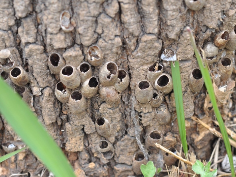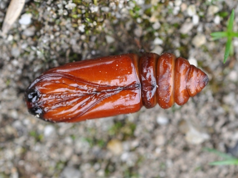 蛾?の蛹(刺激を与えるとブルブルと携帯電話のバイブモード着信時のように小刻みにふるえるのでビックリ。このまま蛹で越冬するもんだと思い込んで家の机の上に放置しておいたら約一週間後に羽化してまたまたビックリ)など