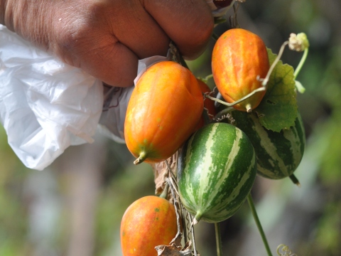 カラスウリ(縞模様のある未熟な果実から真っ赤なものまで見られました)、ホソバセダカモクメの幼虫(派手な装いで目立ちます。アキノノゲシにいました)、シモフリスズメの幼虫、「スズメノショウベンタゴ」(イラガ類の羽化した後の繭)、