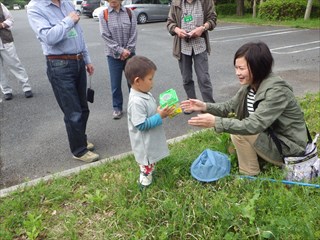 【左】集合場所。開始前の草花遊び 【右】開始後早々、お母さんがモンシロチョウをつかまえた