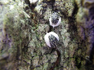 【左・中】路上に落ちたクロバイの花。昨日の下見で撮影 【右】コナラの幹にいたカイガラムシの仲間。種名不明