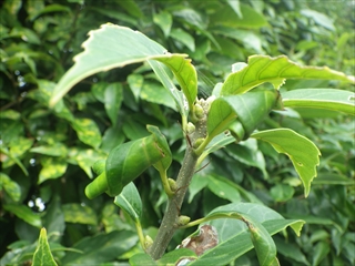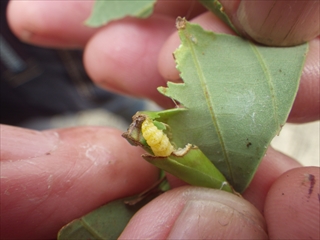 【左】アラカシの葉が巻かれているのを発見 【右】同左の巻かれた葉っぱの中を確かめた