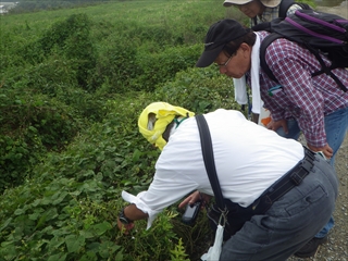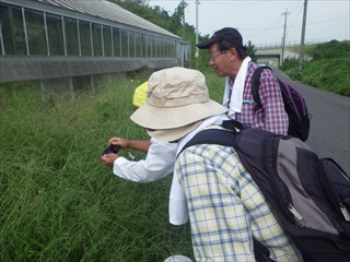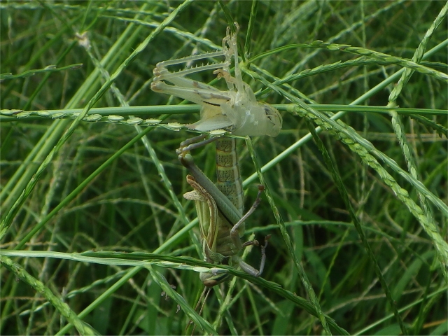 初めての発見とは、「ツチイナゴの脱皮」。コースの道端にメヒシバ群落があり、そこにツチイナゴがいっぱいいて、その中に、ちょうど脱皮中のものがいたのでした。(下記掲載写真の通り)