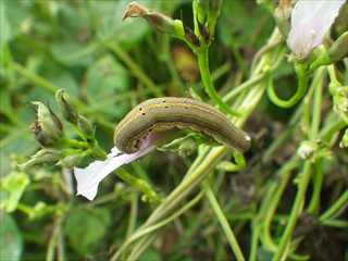 【左】道端のマメアサガオを食す幼虫 【中】同左の幼虫を観察 【右】ツチイナゴの脱皮を撮影中