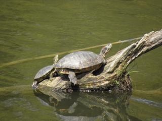 【左】話をしながら進みます     【右】アカミミガメの甲羅干し