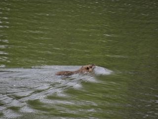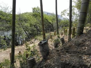 カメや野の花をみながらゆっくりスタート。トンボの姿も見えた。水辺をぬけてワラビをとったりしながら進む。蕨(ワラビ)のあく抜きは重曹がない場合は小麦粉でもよいという情報にびっくり。メインの竹の子は背伸びをして空を目指して伸びていた。おもいおもいに採った竹の子をリュックに入れ帰路に就く。帰り際、池を横切るヌートリアを見かける。ある程度の距離まで泳ぐとこちらをうかがうしぐさ。人間観察をしているかのよう。水鳥たちもヌー君が近付いても平然と泳ぎ慣れている様子。今日は竹工作の小屋前ではゆでた竹の子の配布もあったようだ。(記・竹内秀)