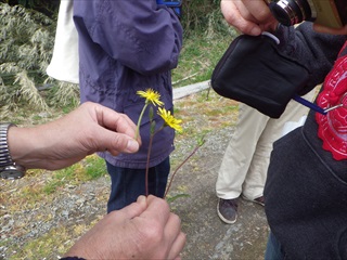 【左】担当指導員の始めのあいさつ。 【右】タンポポとオオジシバリの花。似てるけど違うよね…