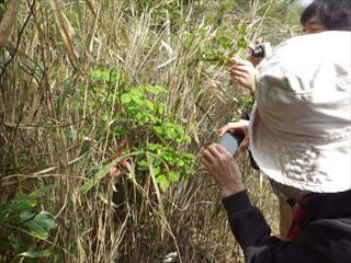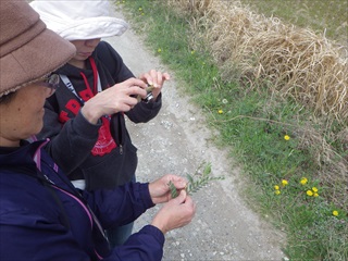 自然交配の様々なサクラたちが満開の微笑みで迎えてくれました。背比べをしているツクシたち。イタドリの芽生えがおいしそう。(これは後でジャムにしていただきました)小道で、タネツケバナの外来種ミチタネツケバナが見つかりました。また、ヒメブタナが数多く見られました。ミミナグサは見つかりませんでした。これはとても少なくなっているそうです。(ミミナグサはオランダミミナグサに比べて、がくや花茎の赤茶色が濃い)アケビやミツバアケビの花がひっそりと咲いていました。田んぼ脇の水溜の水槽でミジンコウキクサらしいものを見つけました。カマキリの赤ちゃんが卵からわらわらと出てきていました。