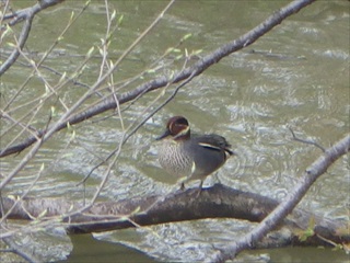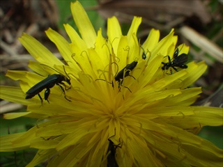 【左】遅くまで残るコガモがいた 【中】モモブトカミキリモドキがタンポポにいっぱいいた