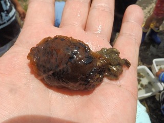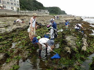 当初は波が荒く、波打ち際はやや危険な気がしましたが、潮が引くとともに波もおさまり、観察には絶好の状況となり、潮だまりや波打ち際で親子ともども生き物の観察、採取に夢中になっていました。