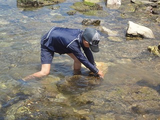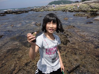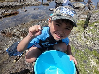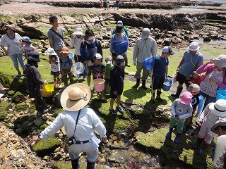 集合場所となった愛知県水産試験場から小佐(おざ)の漁港内を観察しながら峠海岸に到着すると、指導員から観察のポイント、危険な生き物などの注意点が紹介され、待ちわびたように潮溜まりでの観察会が始まりました。今回の観察会は、小さなお子さんの参加が多かったため、最初は生き物を触ることができない方もみえました。しかし、触れても危険のない生き物であると指導員が紹介すると、一様に目を輝かせて生き物に触れる様子が各所で見られました。海岸にたくさん落ちている無数の穴の開いた石については、カモメガイが開けたものであること、生痕化石と呼ばれるゴカイ類の巣穴跡がこの場で見られ、まだまだ指導員としても未知の領域があると感じています。また、自分自身が幼少のころよく遊んだこの峠海岸で、初めて自然観察会が開催できたことに幸せを感じた1日でした。