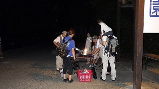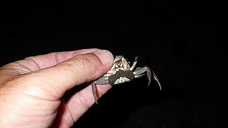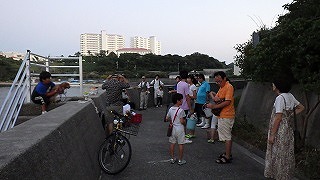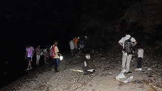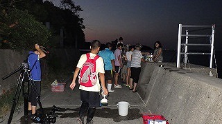 アカテガニを観察した後、罠を引き上げるとウミホタルがたくさん瓶の中を泳ぎ回っていました。大矢指導員からウミホタルの発光には刺激が必要だとの説明があり、刺激を与えるとウミホタルは青く光り、参加者からは歓声が上がりました。陸生ホタルとはまた違ったウミホタルの発光に儚さを感じました。(記・田中達)