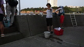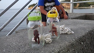 観察会当日の昼間はたいへん暑かったのですが、日が暮れると暑いなりにも風もあり、快適な観察会となりました。今回の観察会には5家族12名の方々にご参加いただきました。聖崎公園駐車場に集合したのち、会場となる弘法大師像が見える長谷崎に移動しました。まだ明るいうちに、豚のレバー、鮭やカマスなどの切り身、薄皮を剥いだチクワなどを入れたガラス瓶の罠を、海底が砂地の海中に沈め30分ほど待ちます。ウミホタルがこの罠にかかるまでの約30分の間に、アカテガニの放仔を観察しました。また、魚とり名人の浅井指導員がアオリイカとクサフグを採取したので併せて観察することができました。ウミホタルは魚や肉などを好んで食べることから、別名「小さな海の掃除屋さん」とも呼ばれており、地元の漁師さんからお話を聞いたところ、会場周辺の海域で盛んにおこなわれているメジロ(アナゴ)漁で使用するメジロ籠を海に入れると、きれいに餌だけが食べられていることも多いそうです。南知多町で生まれ育った私自身も、ウミホタルと夜光虫が同じものであると勘違いをしていました。地元の方でも多くの人が勘違いをしているようです。正しくは、ウミホタルは顎脚綱(がくきゃくこう)・貝虫亜綱・ミオドコパ上目・ミオドコピダ目・ウミホタル科ウミホタル属に属する甲殻類であり、夜光虫は昼間に赤潮として見ることができる海洋性のプランクトンなんだそうです。