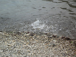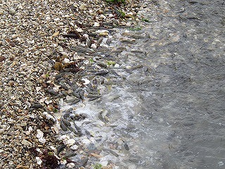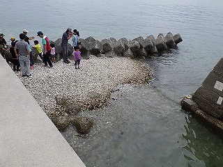 受付準備のため観察会開始の30分前までには海岸に到着して、クサフグの状況を見ていましたが、まばらに見ることができるだけで、事前に作成した資料のようにクサフグが集まるのか半信半疑でした。しかし、午後3時を過ぎた頃からクサフグが集まりだし、午後3時半を過ぎた頃から何かスイッチが入ったかのように一斉に産卵が始まりました。押し寄せる波のリズムに合わせて、クサフグは波打ち際を行ったり来たりしながら水しぶきを上げ産卵をします。クサフグの産卵がピークを迎えた頃、担当指導員の合図で波打ち際まで降りて観察をしました。一斉に産卵が始まると波打ち際は白く変色し、あれだけ警戒心の強いクサフグも、人が近づいた程度では逃げないのは本能なのでしょう。また多くのクサフグは傷だらけの状態でした。今年も無事にクサフグ産卵観察会は終了しましたが、このクサフグの集団産卵がずっと見られる環境を守って行きたいです。(記・田中達)