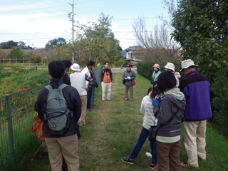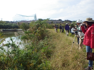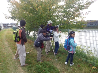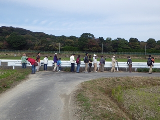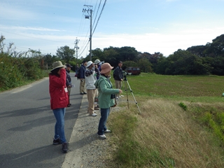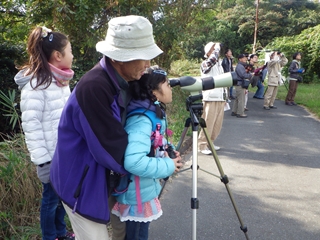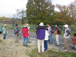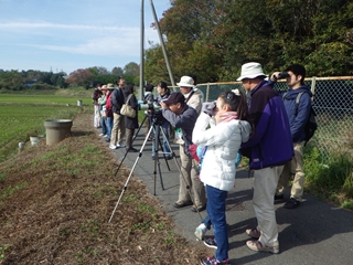 モズの高鳴きに始まってヒヨドリ、メジロが、道沿いの赤や白の実を付けた木々で賑やか。少し行くと電線にツグミが3羽。スコープを合わせてじっくり見る。「茶色と白と黒の模様。ピンと立っていて顔が鋭い」と小学生の女の子の声。途端に大人の皆さんが「どれどれ」と寄って「あれがツグミか・・」と。上空ではカラスが何か追い払っているような飛翔。と、その先に尾の長い鳥が攻撃をかわしながら飛んでいる。「チョウゲンボウです」と古川指導員。猛禽類の出現に皆さん興奮。