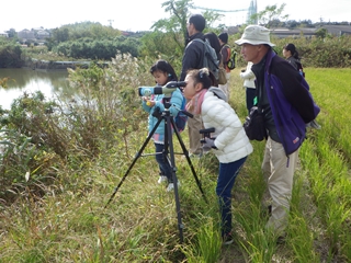 新池ではカワセミが池の縁に沿って飛び立ち、綺麗な色を披露。鹿の子模様の幼鳥ゴイサギも池に伸びた木の枝でジッとしていた。  猛禽類が3種、ケリ、カワセミ、イソチドリなど、普段あまり目にしない鳥たちに会えて、皆さん満足された様子。子どもたちには今日の感激がずっと残って行ってと願う観察会でした。